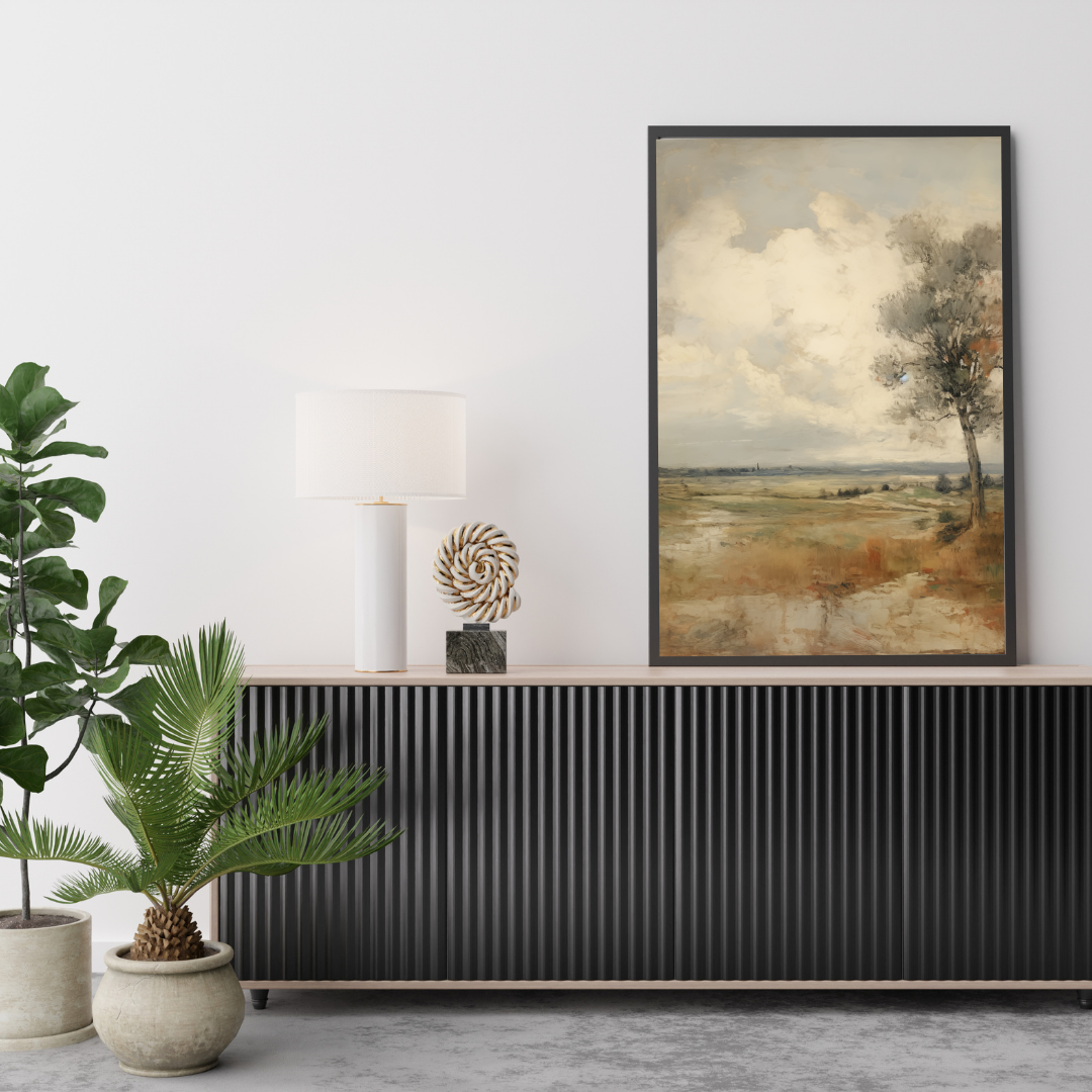 Julisteessa yksinäinen puu kohoaa avaran maiseman keskellä, ja koko kuva rakentuu erilaisista ruskean sävyistä – lämpimistä hiekanväreistä syvempiin maan sävyihin. Tunnelma on rauhallinen ja luonnonläheinen, kuin pysähtynyt hetki syksyisessä tai karun kauniissa maisemassa.