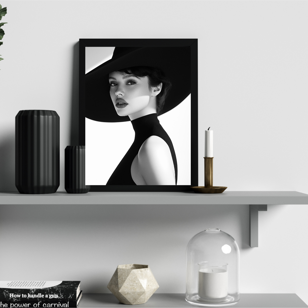 Black hat | Juliste. Ajaton mustavalkoinen valokuvajuliste, jossa nainen poseeraa päässään näyttävä, suuri hattu. Kuvan vahva siluetti ja hillitty sävymaailma huokuvat eleganssia ja klassista muotitunnelmaa.