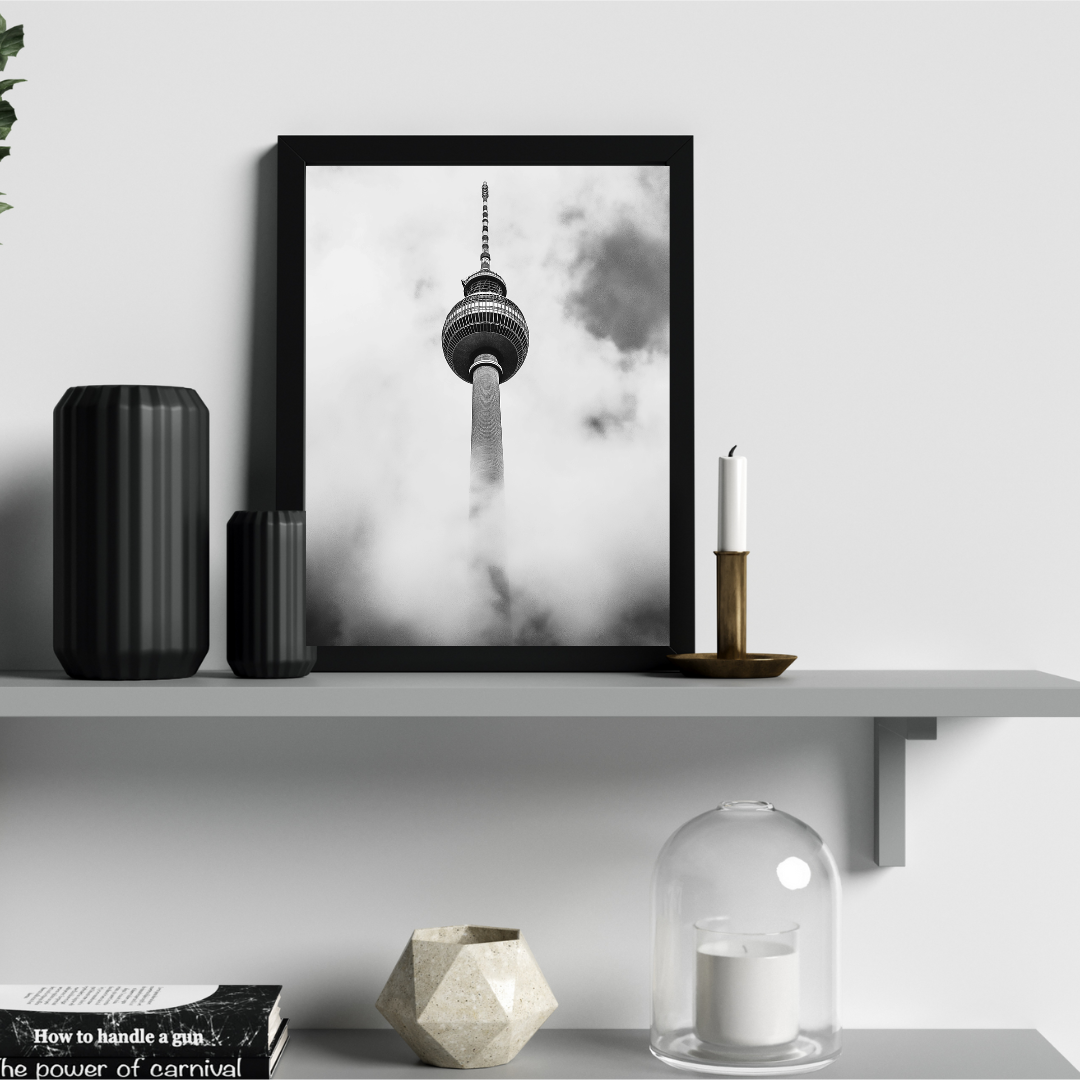 Black tower | Juliste. Vaikuttava valokuvajuliste, jossa kohoaa korkea torni kohti taivasta. Kuvassa korostuvat arkkitehtuurin voima, mittakaava ja urbaani tunnelma.