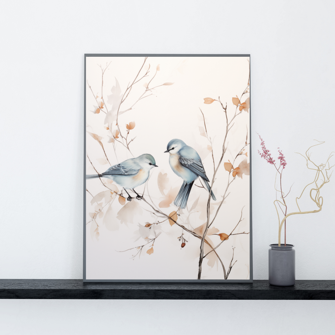 Julisteessa kaksi sinisävyistä lintua istuu vierekkäin oksalla, luoden lempeän ja tasapainoisen sommitelman. Pehmeät sävyt ja lintujen rauhallinen asento tuovat kuvaan herkkyyttä ja hiljaista yhteyttä luonnon kanssa.