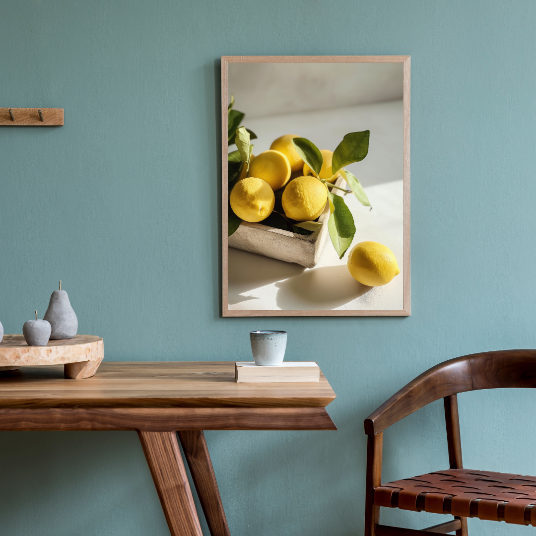 Sitruunat | Juliste. Raikas valokuvajuliste, jossa kirkkaankeltaiset sitruunat lepäävät puisessa laatikossa. Luonnonmateriaalit ja hedelmien eloisat sävyt luovat aidon ja aurinkoisen tunnelman.