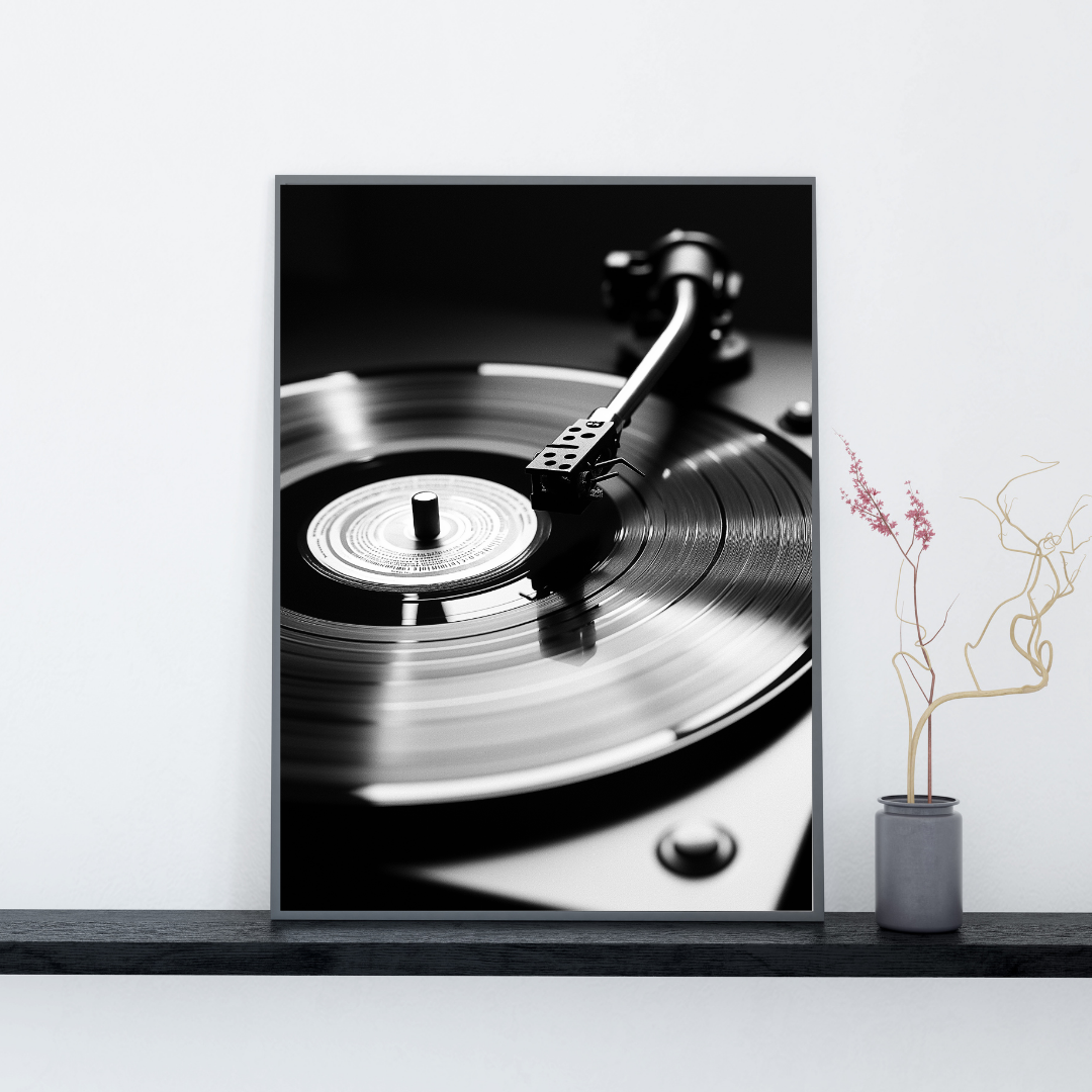 Vinyylilevy | Juliste. Tunnelmallinen valokuvajuliste, jossa vinyylilevysoitin luo retrohenkisen ja nostalgisen ilmapiirin. Kuvassa yhdistyvät analoginen estetiikka ja rakkaus musiikkiin.